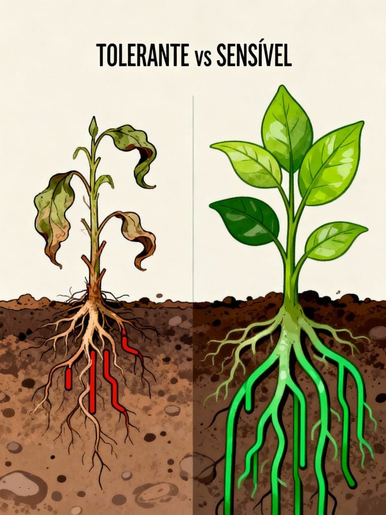 Cultivares sensíveis (como BR-16 em soja): reduzem drasticamente a produção de aquaporinas. A condutividade hidráulica das raízes (capacidade de absorver água) cai 50% ou mais. A planta fecha os estômatos rapidamente demais, a fotossíntese despenca, e a produtividade vai embora.