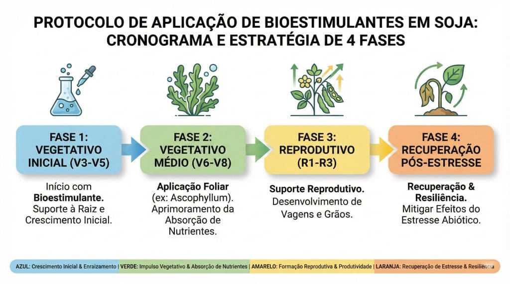 Protocolo de aplicação: Extratos de algas devem ser aplicados via foliar em V6-V8 para proteção preventiva, com reapl icação em R1-R3 para manutenção. A aplicação preventiva é crucial — plantas pré-condicionadas respondem 40-60% melhor ao estresse subsequente. Consulte sempre a bula do produto e orientação técnica para dosagens adequadas.